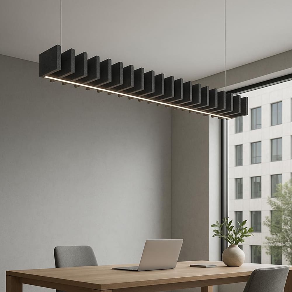 Long acoustic blades with integrated LEDs create linear clarity, reducing noise and enhancing spatial rhythm. Ideal for offices, galleries and architectural hallways.