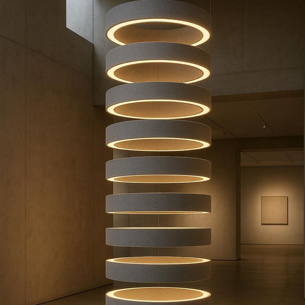 Stacked acoustic circles with internal illumination absorb sound while forming a striking vertical landmark. Ideal for grand interiors.