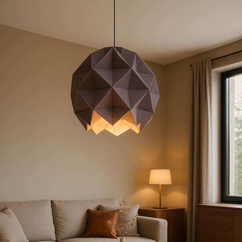 This sculpted polygon pendant combines directional illumination with effective acoustic absorption, perfect for studios, boutique offices and contemporary residences.