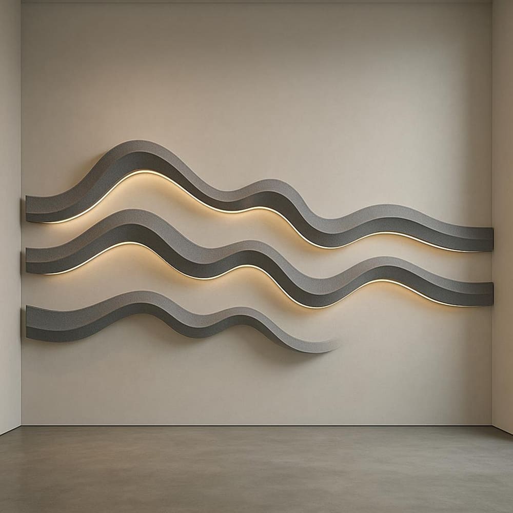 Sculpted acoustic ribbons ripple across the wall, glowing subtly and reducing ambient echo for hallways, restaurants and wellness spaces.