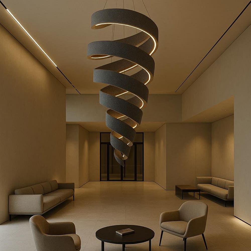 This dramatic hanging element curves acoustic fins around inner light, reducing noise and enhancing vertical presence in tall spaces.