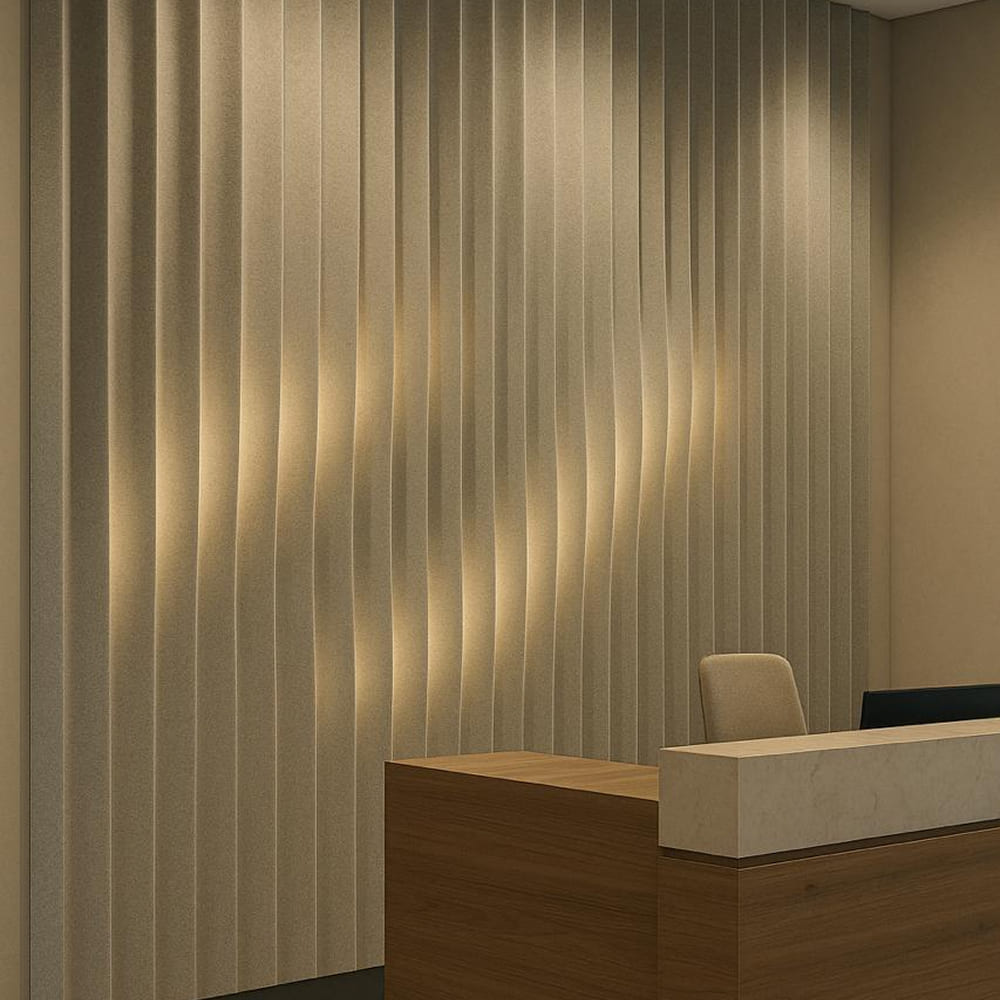 Layered acoustic surfaces with gentle backlighting create a warm, ambient wall that reduces echo and adds depth. Ideal for hallways, reception areas and premium hospitality.