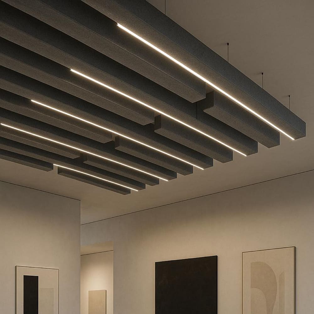 Axis Line Structure arranges slim acoustic blades in perfect alignment, guiding both sound and illumination across the ceiling. Designed for meeting rooms, studios and corporate environments demanding clarity and balance.