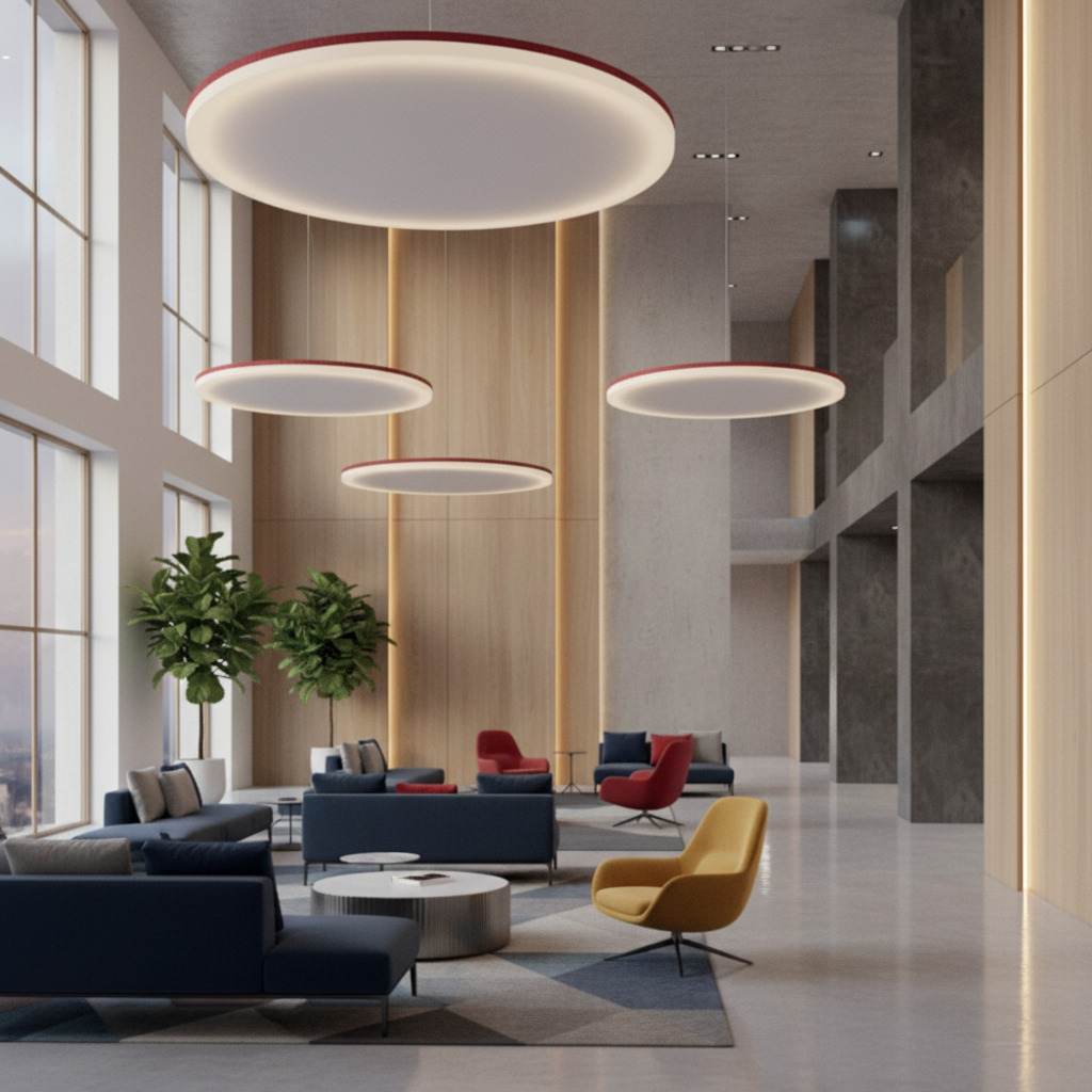 Cirrus spreads diffused illumination across the space through its smooth acoustic discs that hover overhead. It softens noise and enhances the serenity of lobbies, lounges and open hospitality interiors with refined airiness.