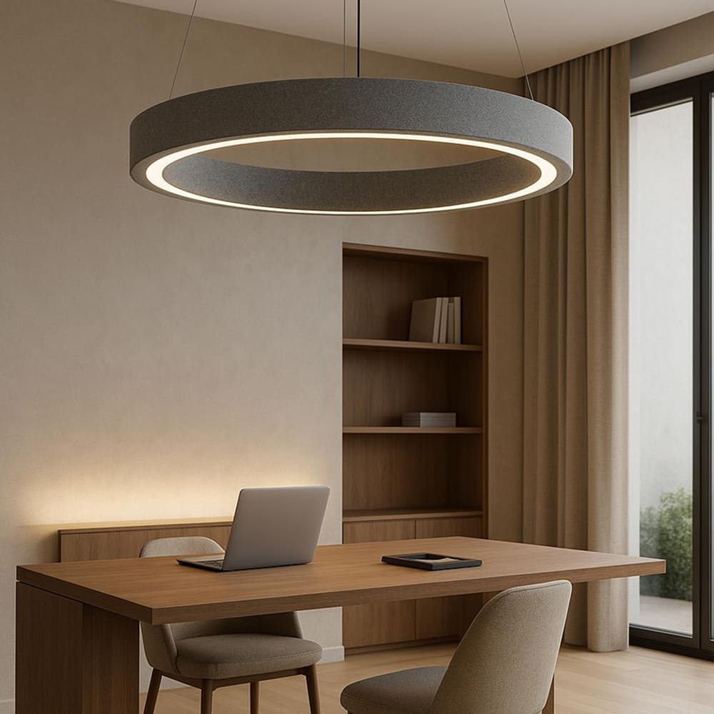This compact acoustic ring provides warm desk-level illumination while absorbing near-field sound, ideal for meeting tables, collaborative zones and reception counters.