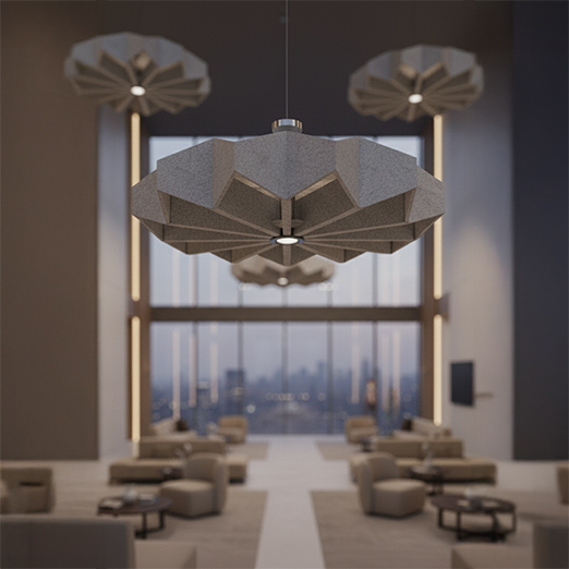 This version of Luma presents polygonal acoustic facets that reduce echo and create a dramatic sculptural effect. A warm central glow fills large rooms with depth and quiet confidence. Ideal for restaurants, large atriums and design-forward commercial interiors.