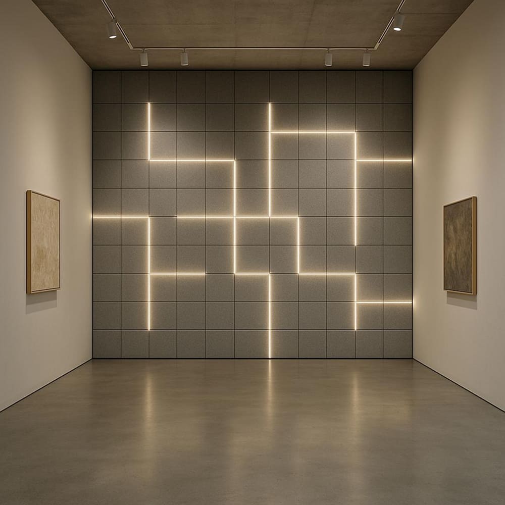 Acoustic grid tiles punctuated by glowing rings reduce noise and create rhythmic light sequences. Ideal for corridors, feature walls and open-plan spaces.