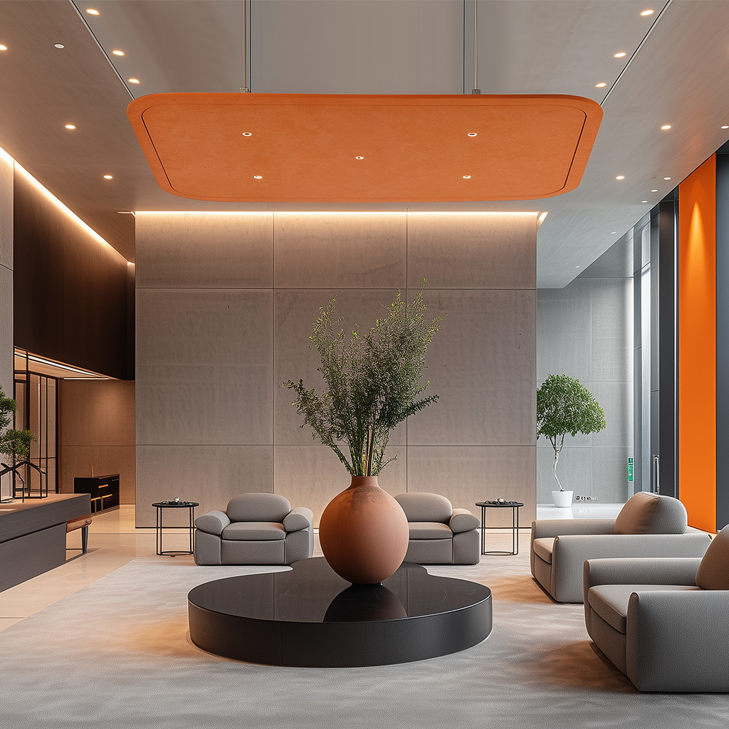 SHH floats overhead as a large acoustic canopy that absorbs noise and diffuses a soft, even illumination. Its minimal geometry defines the atmosphere with clarity and calm, reducing ambient noise and enhancing comfort in large interiors. Ideal for reception areas, open offices, lounges and hospitality environments where spacious tranquility is essential.