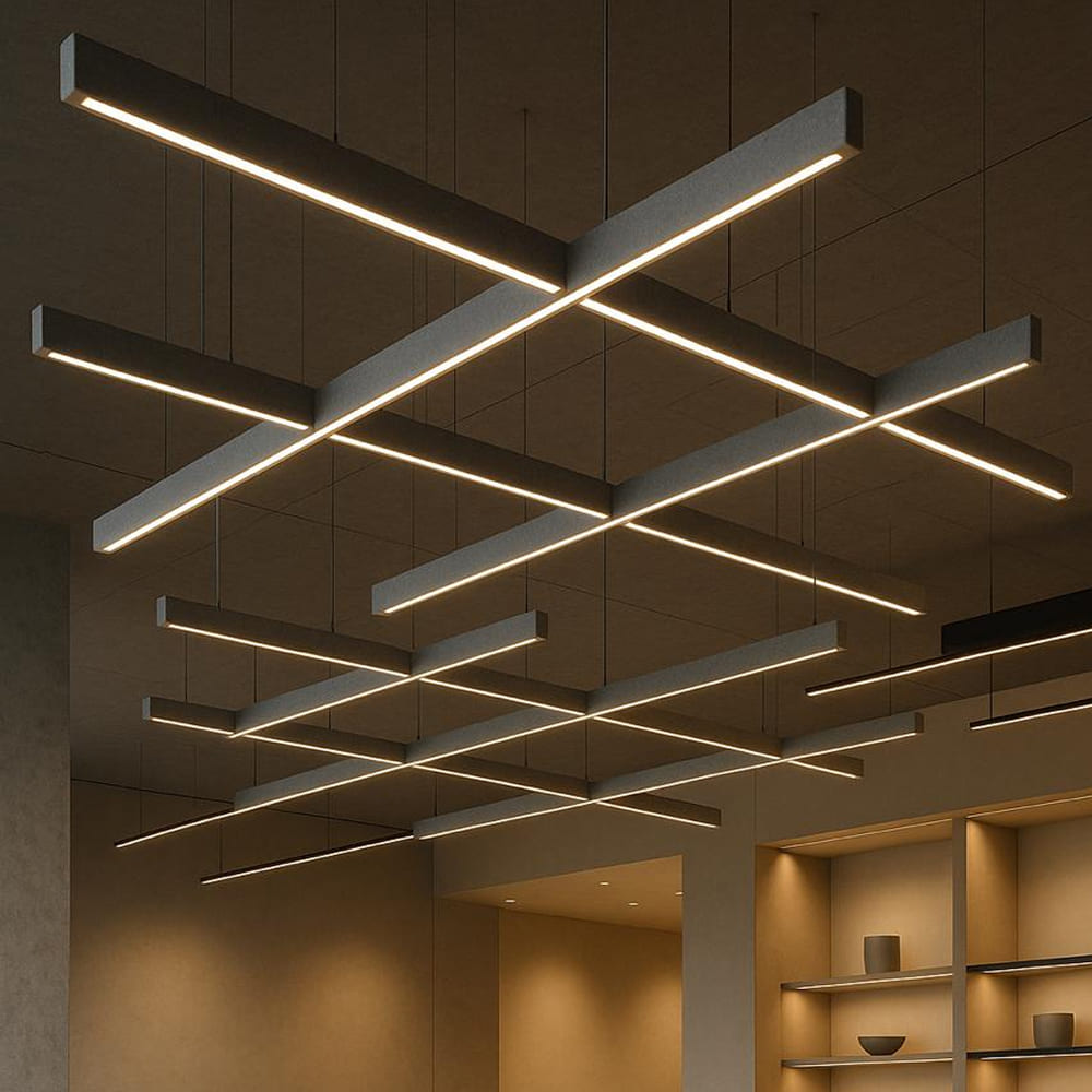 Illuminated acoustic beams cross overhead, absorbing sound and directing soft linear light. Ideal for workspaces, collaborative zones and minimalist architectural ceilings.