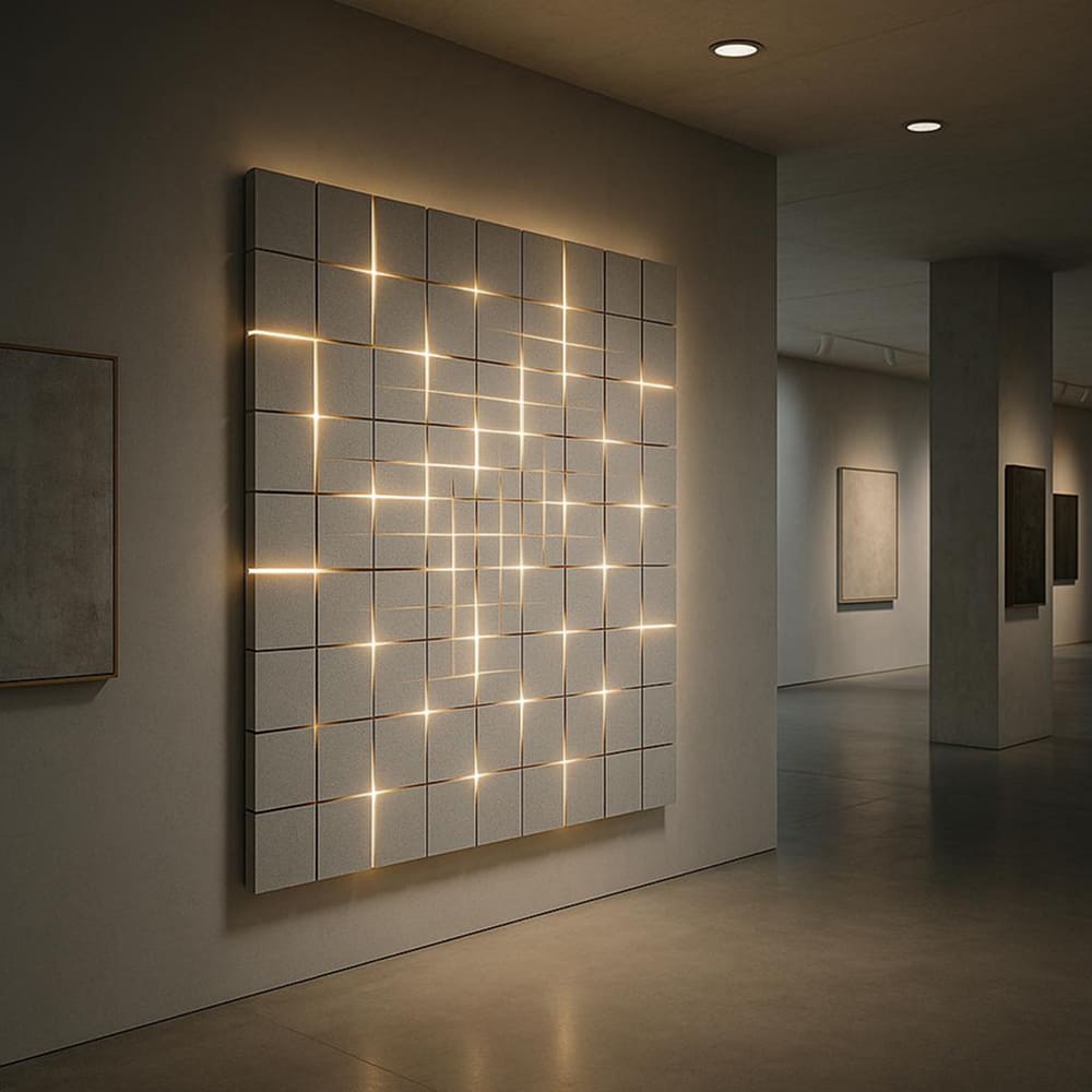 Vortex blends acoustic geometry with internal glow, absorbing sound while forming deep visual gradients. Suited for luxury halls, galleries and statement entrances.